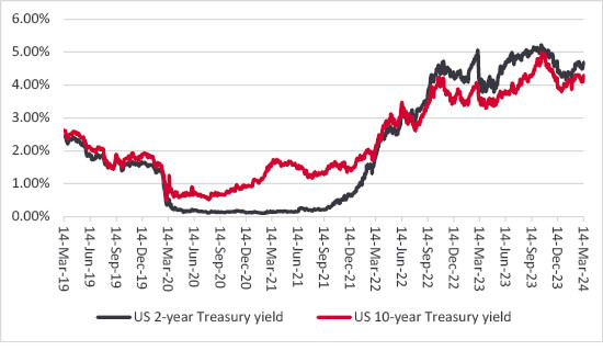 Higher bond yields reflect a recalibration of expectations for interest rate cuts, for the second year in a row. At the start of 2024, the CME Fedwatch data service suggested markets were looking for six, one-quarter point rate cuts from the US Federal Reserve this year, with the first coming in March. Now consensus is for three cuts, starting in June, with the sixth cut of the lowering cycle only coming in September 2025.