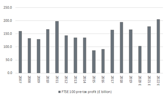 But it does make sense if you think that the consensus earnings forecasts for the FTSE 100 are going to be accurate. An aggregate of the estimates made for each member of the index suggests that the FTSE 100’s total pre-tax profit will be £178 billion in 2021 and £205 billion in 2022.