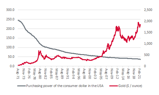 Gold has gained huge value relative to the dollar since 1971