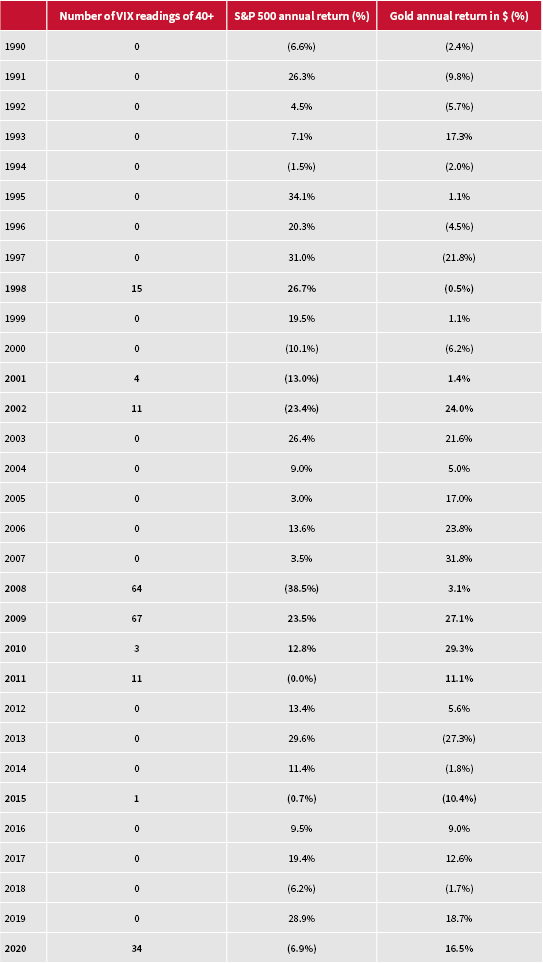 Gold has historically done better than the S&P 500 in years when the VIX hits 40