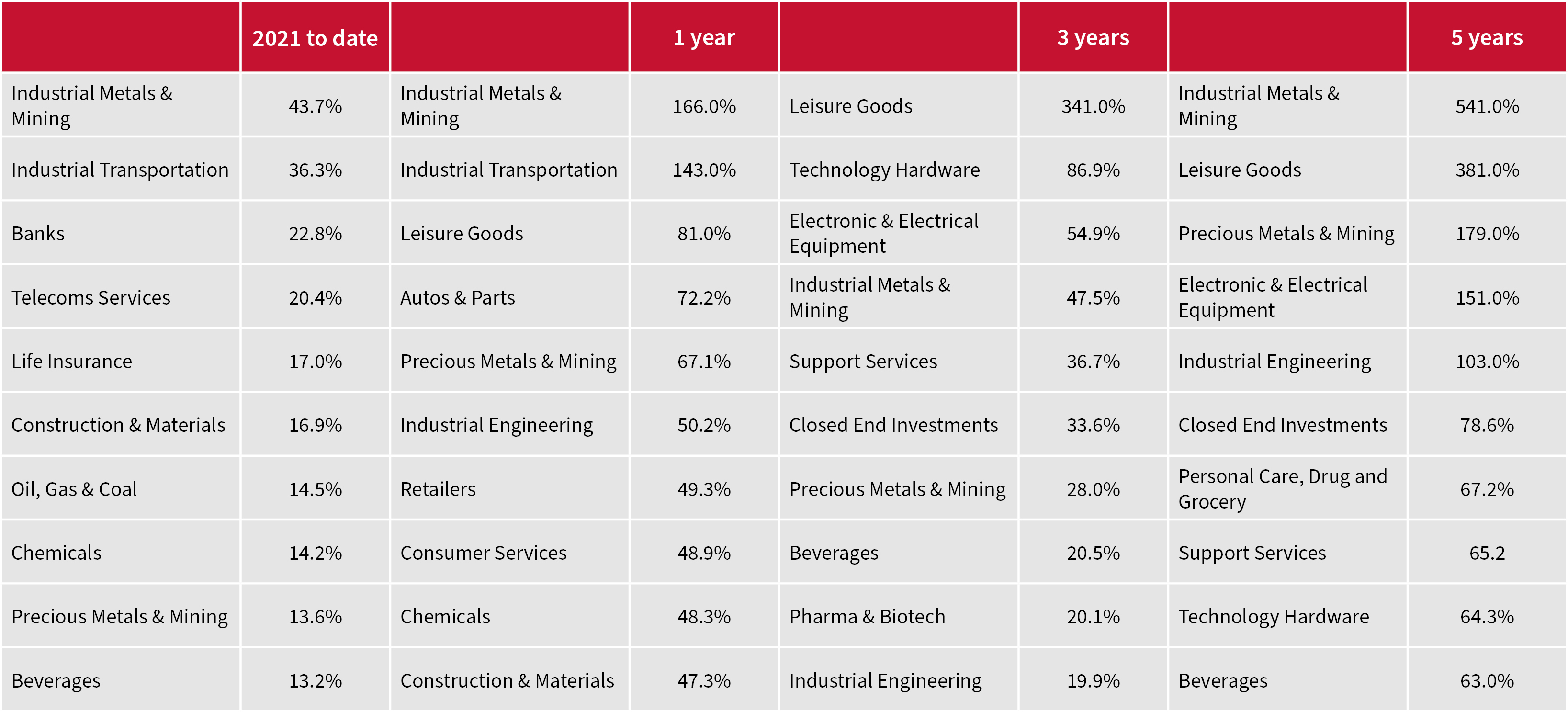 Industrial Metals and Mining is also the leading sector on a three- and five-year view. That may lead some investors to wonder if they have missed the boat. If the Fed is right, then the answer may be ‘yes’. But if inflation grabs hold, or we simply get a rip-roaring economic recovery, or commodities are in the early stages of a new ‘super-cycle,’ as some are suggesting, then miners could yet offer some of the treasure that portfolio builders are seeking.