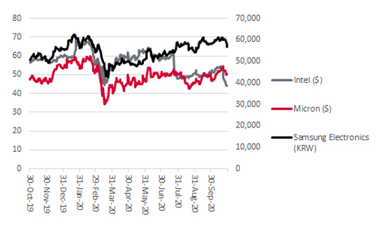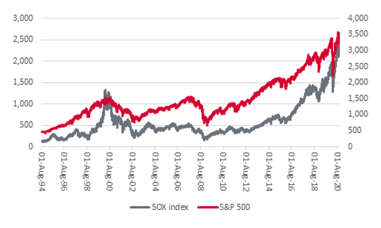 The first is as a barometer for economic activity. The sheer ubiquity of silicon chips means that they are a pretty fair proxy for economic growth and broader end-market demand. A consensus forecast of 5% sales growth in 2020 looks pretty good given the broader economic backdrop, and is testimony to how chip sales are getting a boost from the pandemic thanks to higher demand for servers and cloud computing capacity; bandwidth-providing telecoms equipment; and laptops and home computing. Beyond such mega-trends, the members of the SOX index are very driven by product and inventory cycles – their order books will be among the first to notice any subtle shifts in customer behaviour which may be indicative of a wider economic trend that is coming around the corner in a few months’ time.