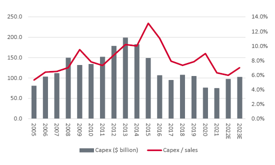 Source: Company accounts, Marketscreener, for BP, Chevron, ConocoPhillips, ENI, ExxonMobil, Shell and TotalEnergies.