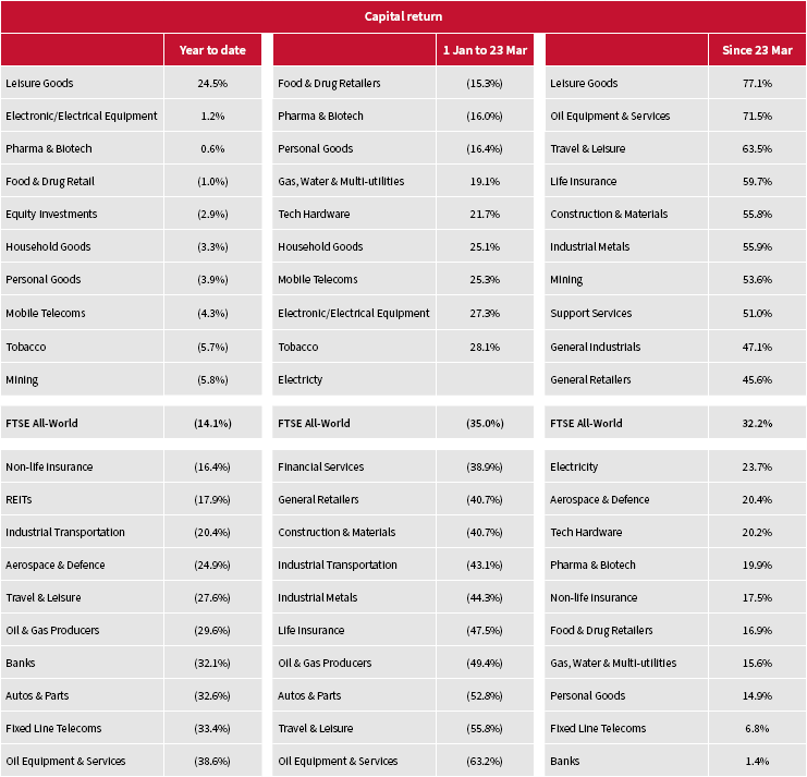 Leisure Goods (which is essentially Warhammer gaming specialist Games Workshop) is the top performer, while relatively defensive areas such as Pharmaceuticals & Biotech, Food & Drug Retailers, Household Goods, Personal Goods and Tobacco are also among the top ten. The laggards include some areas which have been hit hardest by the lockdown, such as Travel & Leisure (and, by association with that, Aerospace & Defence), as well as Real Estate Investment Trusts, by dint of landlords’ exposure to retailers.