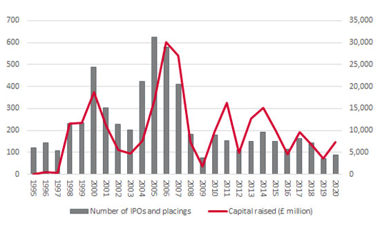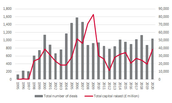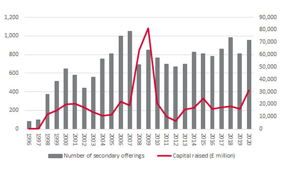 Over 950 secondary deals, including rights issues, placings for cash, open offers, subscriptions and further issues took place in 2020, perhaps understandably as many companies tapped their shareholders for fresh liquidity to help see them through the pandemic and the subsequent recession. London-listed and quoted firms raised over £31 billion, the highest figure since 2008–9 when companies were again in cash-raising, crisis-management mode.