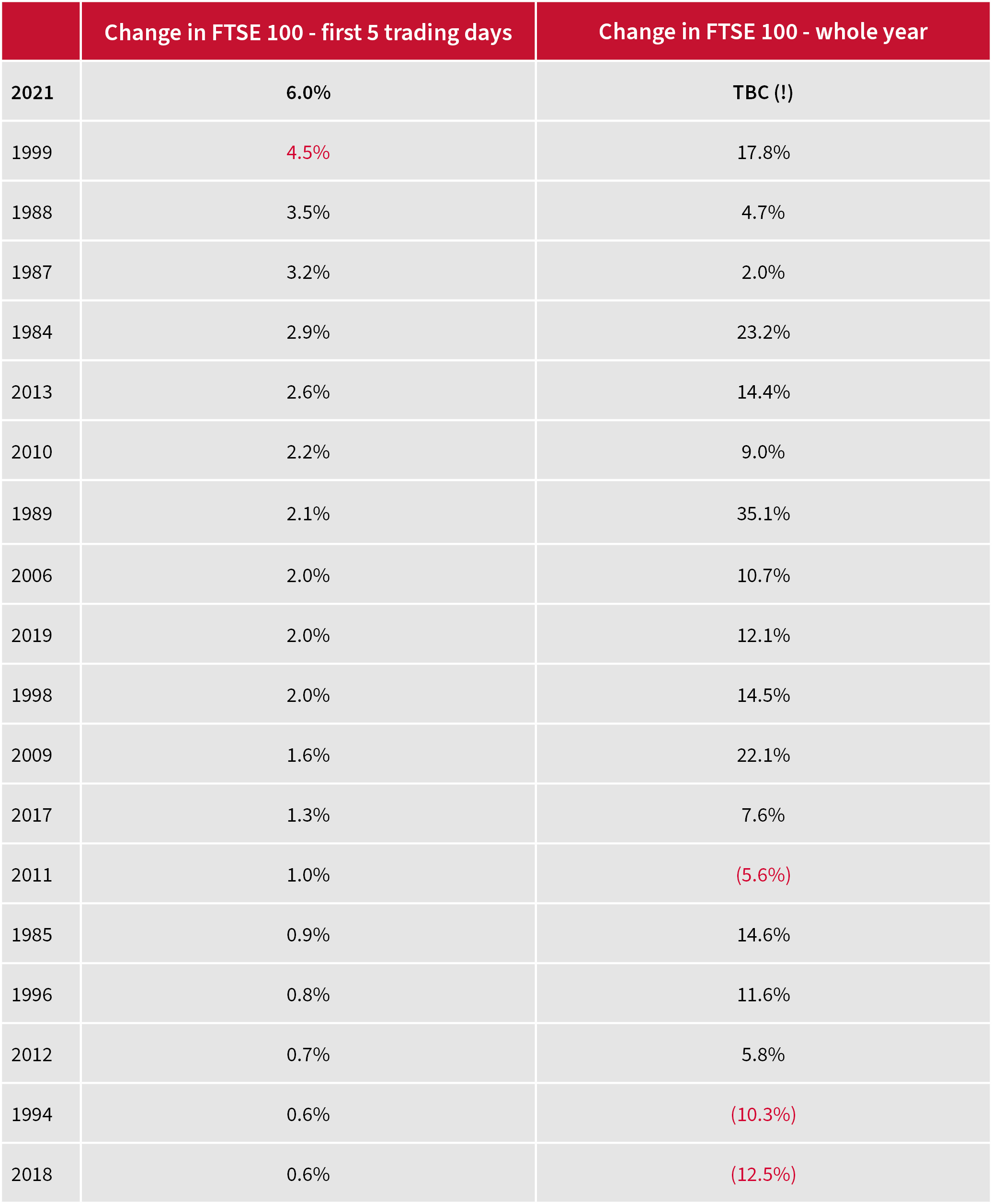 “It is eye-catching to see how the FTSE 100 has generated positive capital returns on every occasion bar one when it has begun the year with an opening-week gain of 1% or more.”