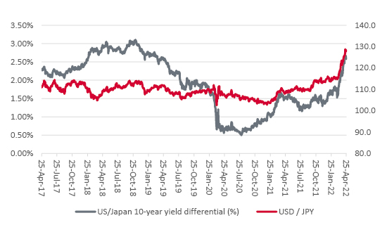 In Tokyo, inflation may stand at a 42-month high, but the headline rate is still only 1.2%, below both the BoJ’s 2% target and miles below the prevailing 8.5% headline rate in the USA. As a result, BoJ Governor Haruhiko Kuroda is in no rush to raise the headline base rate from minus 0.1% and remains committed to a policy of Qualitative and Quantitative Easing (QQE) with Yield Curve Control (YCC), whereby it will permit 10-year JGB yields to move up or down by 25 basis points (0.25%) from its 0% target.