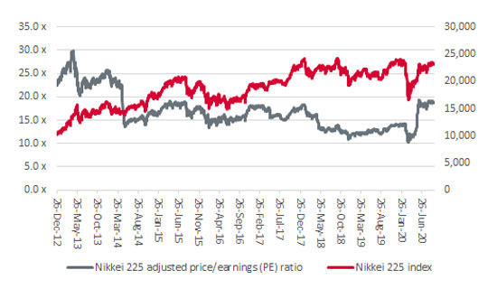 2. Japan could offer value. The fact that the bear cases are not especially new would suggest they are at least partly factored into valuations already. In addition, the Abenomics actively promoted corporate governance reforms and even prompted the creation of a new stock index, the JPX Nikkei 400, where return on equity, dividend and buyback policies and shareholder relations were key entry criteria. Before the pandemic, Japan was trading on a lowly price/earnings ratio (PE) relative to its history, thanks to Abenomics’ focus on profitability, and the latest spike in the PE simply reflects the hit to corporate earnings from the pandemic-related global recession.