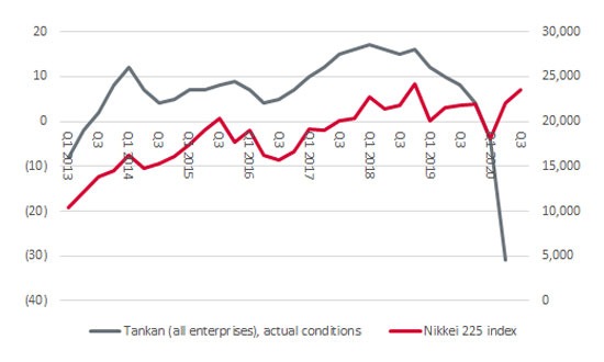 3. Japan provides exposure to a global recovery. The Japanese market is packed with high-quality manufacturers and exporters, giving it leverage into whatever form of global upturn follows the pandemic. Business confidence is currently low, using the quarterly Tankan – or the Business Short-Term Economic Sentiment Survey – as a guide, but any upturn could quickly feed through to share prices.