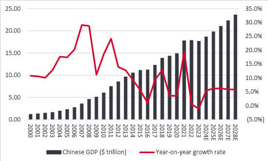 For all of its current challenges, China’s economy is still the second largest in the world, trailing that of only America. According to data from the International Monetary Fund, Chinese GDP grew from $1.2 trillion in 2000 to almost $18 trillion in 2023 (and thus as big as Germany, Japan, India, the UK and Brazil combined). That is a compound annual growth rate of 12.4%.