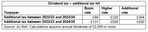The move to cut the tax-free dividend allowance in half from £2,000 to £1,000 from 6 April will drag many more people into paying the tax, while the further cut to £500 in 2024 will cast the tax net even wider. The cut will mean that from 2024 an additional rate taxpayer who has more than £2,000 of dividends at the moment will pay £590 more in tax, while a basic-rate taxpayer will face an extra £131 on their tax bill.